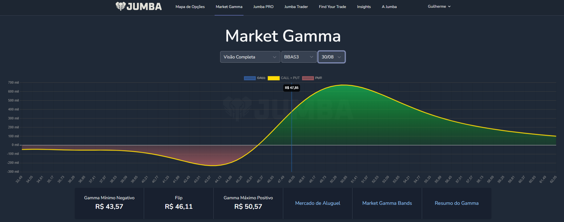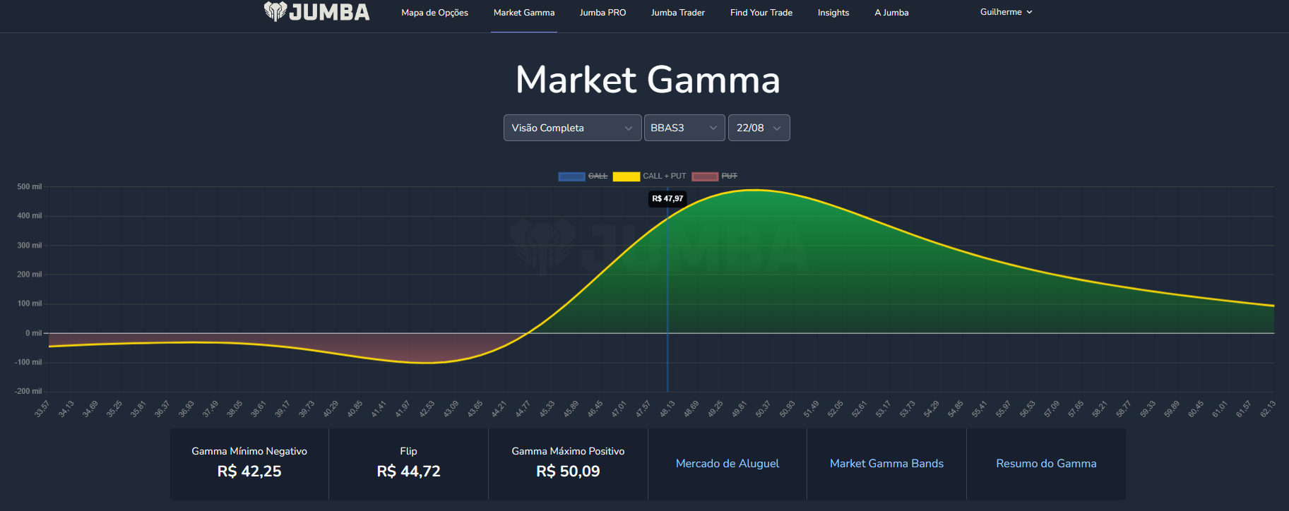 Percebe-se que no dia 22Ago23 o mercado de opções mostrava grande fluxo de exposição contratual em Gamma Positivo. Tal exposição a Gamma Positivo mostrava-se 5x maior para o pico de curva em BRL 50.09, quando comparado com o vale de curva em Gamma Negativo ao preço de BRL 42.25.